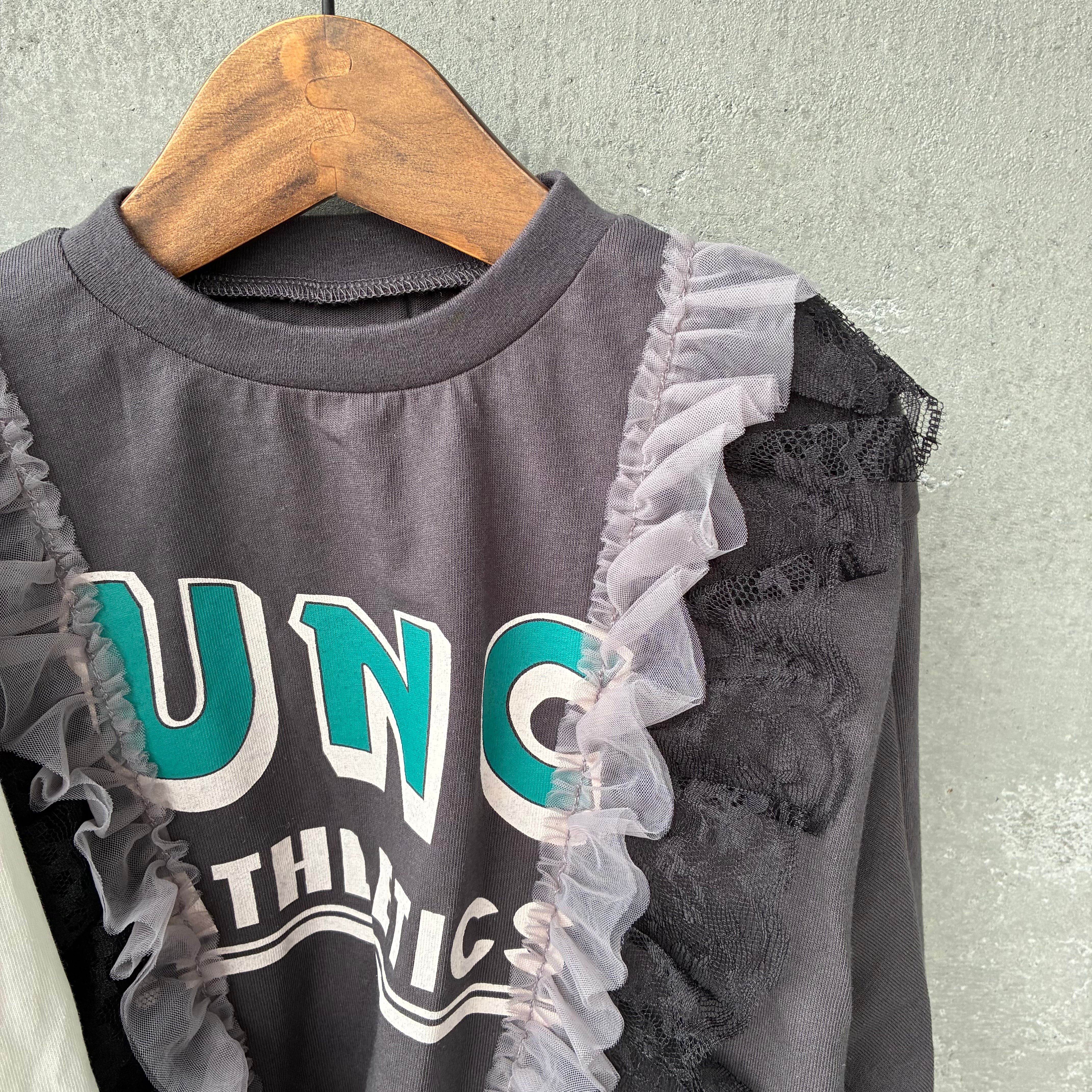 ロゴTシャツにソフトチュールとレースを重ねた、リメイクライクなTシャツ