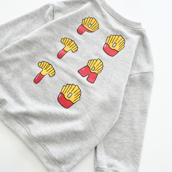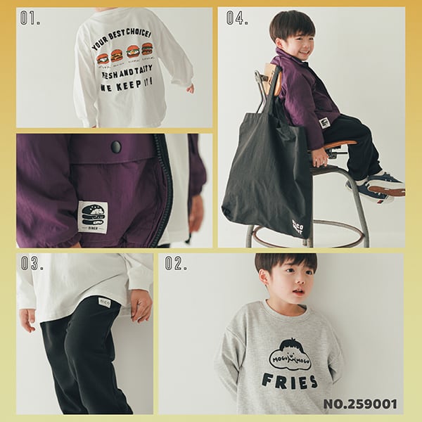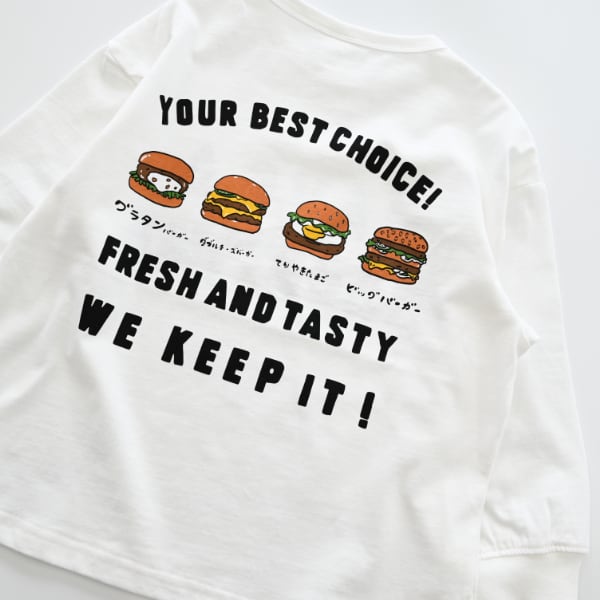 ロングTシャツはフロントはシンプルロゴで合わせやすく、バッグプリントはハンバーガーの手書きプリントが入ってます。トレーナーはバックプリントがポテトフォントのプリントでフロントは可愛いフェイスプリント